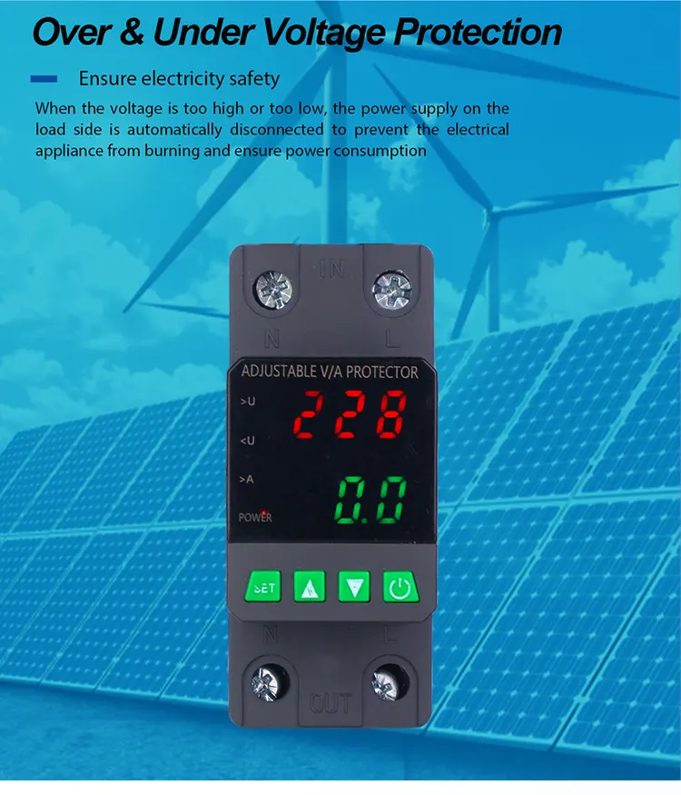 Được trang bị một màn hình kỹ thuật số và được sản xuất với các thành phần điện tử mô -đun nhập khẩu, nó có độ tin cậy và hiệu suất cao. Bộ bảo vệ tự động và nhanh chóng cắt nguồn điện trong các điện áp bất thường (như quá điện áp, quá điện áp hoặc dao động lưới) và khôi phục nguồn điện sau khi điện áp trở lại bình thường.